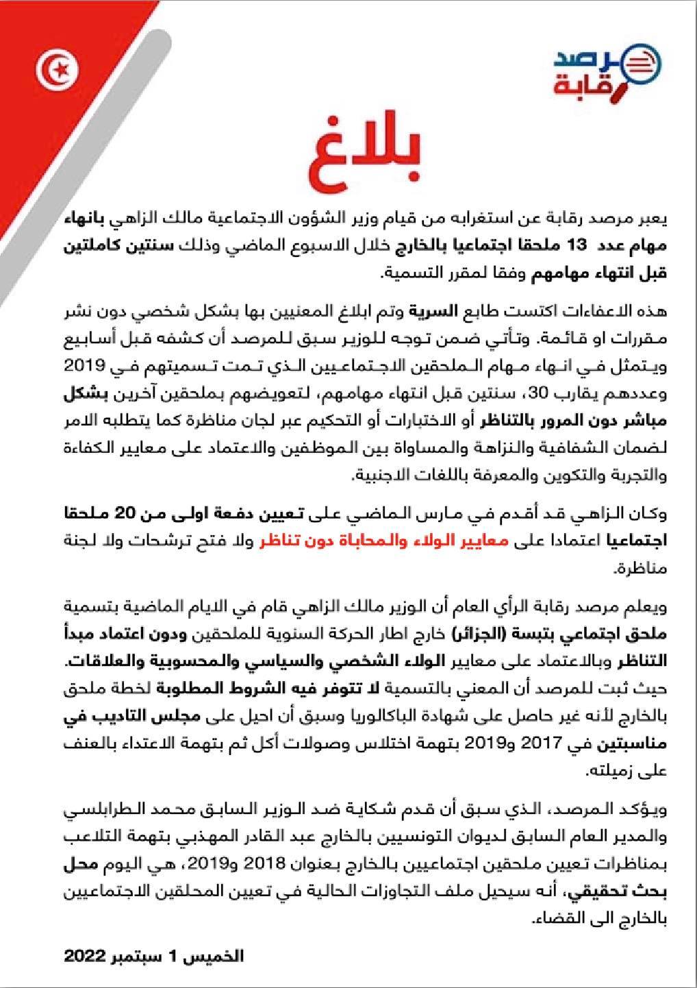 سبق لمرصد رقابة أن قدم شكاية ضد الوزير محمد الطرابلسي بتهمة التلاعب في تعيينات الملحقين الاجتماعيين. ولكن ما نلاحظه اليوم أن مالك الزاهي تجاوز محمد الطرابلسي بشكل شاهق. لأن محمد الطرابلسي تلاعب بالتعيينات بالاعتماد شكليا على القانون والمناظرات وبوضع المدير العام لديوان التونسيين في الخارج في الواجهة، أما الزاهي فهو يعفي ويعين كما يشاء دون اعتبار للقانون والاجراءات المعمول بها. وهو يبدو في سباق مع الزمن لتعيين أكثر ما يمكن من مقربين له قبل مغادرته الوزارة.