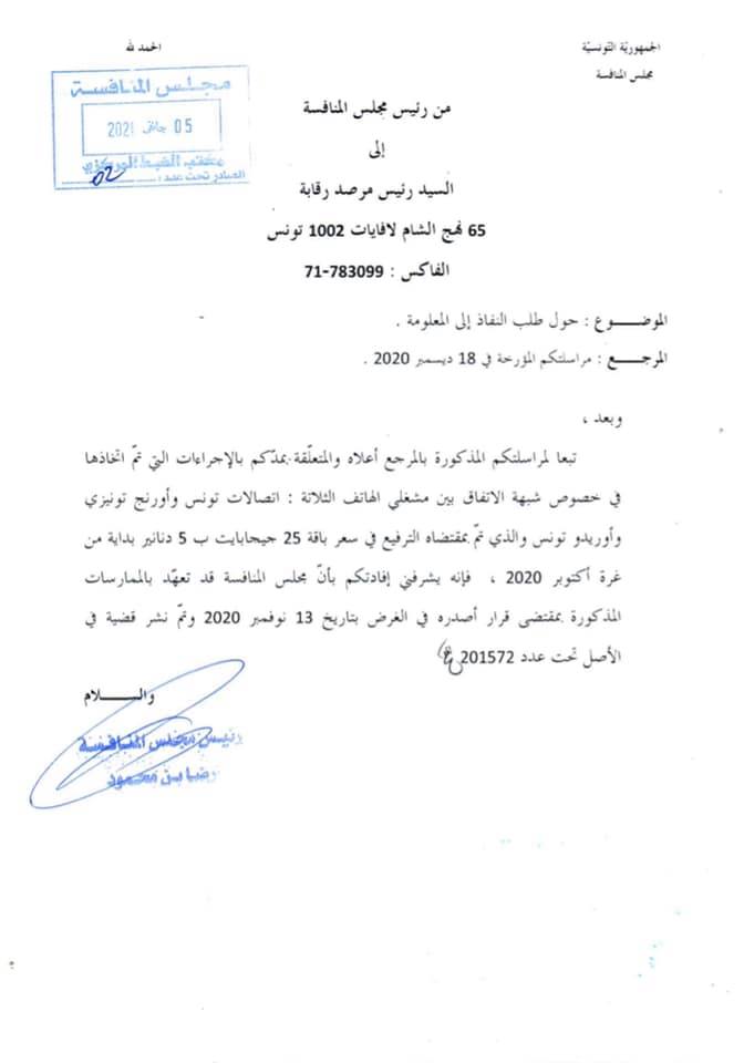 مجلس المنافسة يؤكد في مراسلة وجهها أمس الى مرصد رقابة، ردا على طلب نفاذ الى المعلومة، أنه قام بنشر قضية في الأصل تحمل عدد201572 بخصوص شبهة الاتفاق بين المشغلين الثلاثة: اتصالات تونس واورانج واوريدو ، والذي تم بمقتضاه الزيادة في أسعار باقات الانترنت ب5 دنانير بداية من غرة أكتوبر.