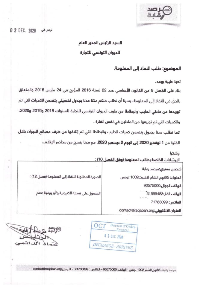 وجه مرصد رقابة طلب نفاذ الى المعلومة بخصوص عمليات الاتلاف الجارية للحليب والبطاطا. وقد تم تزويد بعض المساحات الكبرى بكميات من الحليب الذي تقارب صلاحيته على الانتهاء مع العودة الى الثمن القديم 1120 م في محاولة لإنقاذ بعض الكميات وتقليص الكميات المتلفة. سيطلب مرصد رقابة من رئيس الحكومة فتح تحقيق بخصوص الشبهات في عملية شراء وتخزين وإتلاف المواد الغذائية الموردة بشكل استثنائي لتحميل المسؤوليات واستخلاص العبر وإيقاف النزيف.